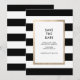 Esta elegante, atrevida y moderna tarjeta de Save the Date para boda a rayas negras y blancas es extremadamente trendy. Con una superposición blanca bordeada con lámina de oro rosa falsa, el texto está escrito en una fuente sans serif elegante y atemporal. La parte trasera de la tarjeta presenta las mismas rayas horizontales negras y blancas atrevidas que se muestran en la parte delantera. La invitación perfecta para la novia exigente, y parte de un conjunto de invitaciones.