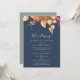 Esta tarjeta de recepción de elopement azul marino con hojas de otoño es perfecta para una fiesta post elopement de octubre. El diseño rústico moderno cuenta con impresionantes hojas de otoño pintadas a mano en acuarela en tonos coloridos de amarillo, naranja quemada y rojo borgoña que resaltan en un fondo azul marino. Las tarjetas de RSVP se venden por separado.