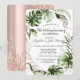 Una moderna, chic y glamurosa con goteo de brillo en un fondo de oro rosa, y hojas tropicales.
