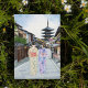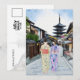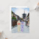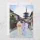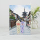 Esta postal muestra un retrato acuático de dos mujeres en kimonos caminando por la calle frente al templo Hōkan-Ji en Kioto.