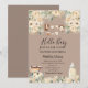Colores neutros de bebé, beige claro, marrones claros y flores blancas. Toque perfecto para tu baby shower. ¡Felicidades por tu embarazo!