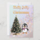 Celebrate the season with this adorable and festive flat Christmas card. The design features a cheerful "Holly Jolly Christmas" message in elegant gold typography. A cute penguin with a pink scarf stands next to a beautifully decorated Christmas tree with gifts, set against a magical pastel confetti background in soft shades of pink, blue, and purple.