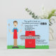 Esta es la invitación perfecta para empezar esa barbacoa. Esta invitación está situada en un fondo azul claro con césped en la parte inferior. Hay un hombre parado con utensilios de cocina en cada mano y lleva puesto un delantal rojo. Hay un nido de asador de gas rojo para él. ¡Adorable para cualquier fiesta! ©craftyclip