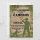 Esta invitación del partido personalizado tiene un tema de misión militar. Imágenes de hombres verdes del ejército juguetones soldados se imprimen en la parte inferior, con uno en un paracaídas en la parte superior. Un patrón camuflado bordea las imágenes.