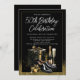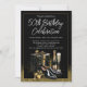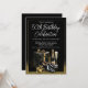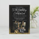 Celebra con estilo con nuestra Clásica de los Hombres ¡cualquier invitación de fiesta de cumpleaños número! Con elegantes regalos negros y dorados, champán y zapatos de vestir con un sofisticado fondo negro y dorado. Perfecto para una celebración inolvidable y de lujo. Personaliza con tus datos de edad y eventos.