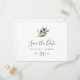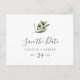 Esta moderna carta horizontal de aceituna, salvo la postal de fecha, es perfecta para un boda boho. El diseño rústico y elegante presenta una sencilla acuarela de hojas botánicas verdes y aceitunas negras en una pequeña rama de ambiente mediterráneo clásico.