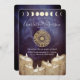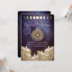 Esta invitación de fiesta mística y encantadora presenta un fondo de diseño celestial con una imagen del cielo nocturno, estrellas y las fases lunares impresas cerca de la parte superior. Una rueda de horóscopo dorada se coloca en el centro con velas derretidas y polvo de brillo dorado colocado en la parte inferior. La fecha de nacimiento y el signo zodiacal se imprimen debajo del nombre de la muestra. La parte trasera de la invitación presenta un fondo celestial coincidente.