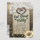 Estilo Rústico de Campo COMER Beber y Fiesta / COMER Beber y Casarse Tarjetas de Invitación para Celebración de Boda - Pareja Herradura Antigua Corazón con Lazo de Cuerda y Encaje Blanco, Girasol, Luces de Cadena y Tela de Arpillera sobre Fondo de Madera de Granero Antiguo.