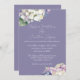 Esta invitación de boda floral romántica presenta hortensias purpura y blancas al estilo acuarela sobre un fondo de color lavanda púrpura polvoriento. Un delicado ramo de flores de hortensia se muestra en la parte superior y otro en la parte inferior.