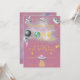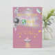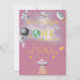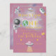Una adorable invitación al cumpleaños con un astronauta, barcos con cohetes, la Tierra y estrellas ambientadas en un oscuro fondo rosado. Invitar a nuestros adorables chicas a ver de vuelta a una estrella de tiro coordinadora. Visite nuestra tienda para toda nuestra línea, incluyendo rifas de pañales y tarjetas de reserva.