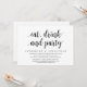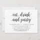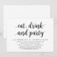 Tarjeta de invitación de huida de boda con tema de escritura moderna (Comer, beber y fiesta). Es perfecta para su cena de boda informal junto al lago, baile y fiesta de huida de boda.