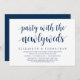 Tarjeta de invitación de huida de novios con guión moderno en tema azul marino elegante (Celebración de Felices para Siempre). Es perfecta para su cena de huida de novios en un ambiente relajado junto al lago, baile y fiesta.
