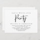 Tarjeta de invitación de huida de novios con tema de escritura negra moderna (Fiesta Felices para Siempre). Es perfecta para la recepción de huida de novios / fiesta de celebración post-boda. Agrega tus detalles en fuente / letra negra coincidente.