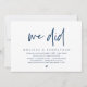 Tarjeta de invitación de huida de boda con tema de escritura azul marino moderno (lo hicimos). Es perfecta para la recepción de su boda / fiesta de celebración después de la boda. Agregue sus detalles en la fuente / letra coincidente.