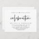 Tarjeta de invitación de huida de novios con tema de escritura negra moderna (celebración de feliz para siempre). Es perfecta para su recepción de huida de novios / fiesta de celebración después de la boda. Agregue sus detalles en fuente / letra negra coincidente.