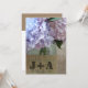 Una invitación del boda que ofrece una foto de un tarro de albañil de hydrangeas purpúreos claros y azules. La cinta de la arpillera se envuelve alrededor del tarro. Personalice con sus iniciales en frente. Personalice el texto encendido detrás con los detalles de su ocasión. La fraseología es de novia y de novio "así como sus familias."