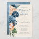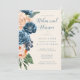 Una florida y llamativa multitud de rosas en tonos azul y melocotón polvorientos es el punto fuerte de muchas de las piezas de esta suite boda que también cuenta con un elegante guión de texto y un diseño moderno. La invitación a la cena, que se realiza con arreglo a un ensayo, incluye todo lo anterior, así como un hermoso resumen de acuarelas al revés en polvorientos tonos azules. Añada fácilmente los nombres de la novia y del novio y los detalles del evento utilizando la plantilla proporcionada. Busque ID584 para ver los productos coincidentes y otras opciones de color para este diseño.