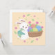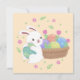 Una ilustración linda de un conejo sosteniendo un huevo de Pascua delante de una cesta llena de huevos de Pascua coloridos
