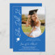 Fotografia Graduation Party Modern Elegant Script Invitation muestra tu foto favorita con el texto "She made it" en una elegante tipografía de escritura caligráfica sobre un fondo azul. Añada a continuación la información de su invitación para graduarse. Personalice editando el texto en los cuadros de texto proporcionados. Enviar como descarga digital instantánea, como invitación física por correo o ambos. Creado por ©2025 Evco Studio www.zazzle.com/store/evcostudio
