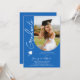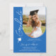 Fotografia Graduation Party Modern Elegant Script Invitation muestra tu foto favorita con el texto "Graduado" en una tipografía elegante de escritura caligráfica sobre un fondo azul. Añada a continuación la información de su invitación para graduarse. Personalice editando el texto en los cuadros de texto proporcionados. Enviar como descarga digital instantánea, como invitación física por correo o ambos. Creado por ©2025 Evco Studio www.zazzle.com/store/evcostudio