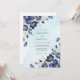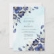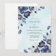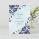 This design features deep indigo anemones with shimmering gold metallic outlines. Set against a soft light blue watercolor wash, the botanical elements include delicate silver leaves and floating petals. It evokes a serene and majestic winter mood, perfect for an elegant seasonal event.