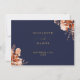 Una tarjeta de información de detalles de boda floral rústica elegante personalizada con los detalles especiales de su boda en tipografía dorada y sus nombres y fecha de boda en el reverso sobre un fondo azul marino. Diseñado por Thisisnotme©