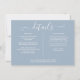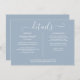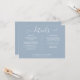 Una elegante tarjeta de información de detalles de boda personalizada con sus detalles especiales en tipografía elegante y sus nombres y fecha de boda al revés en un polvoriento fondo azul. Puede personalizar el fondo del color de su tema boda favorito. Diseñado por Thisisnotme©