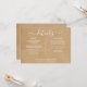 Una elegante tarjeta de información sobre detalles de boda personalizada con sus detalles especiales en una tipografía elegante y sus nombres y fecha de boda al revés en un rústico fondo kraft. Puede personalizar el fondo del color de su tema boda favorito. Diseñado por Thisisnotme©