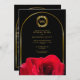 Elegante invitación a bodas negras y rojas, con un lujoso fondo negro, refinada tipografía de oro y un llamativo acento de rosa roja. El diseño se realza con un armazón dorado y hojas de laurel que muestran las iniciales de la pareja, añadiendo un toque de sofisticación y personalización. Perfecto para bodas formales, de lujo o de corbata negra, esta invitación es totalmente personalizable con sus nombres, detalles de bodas, fotos y monograma.