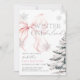 Invitación de primer cumpleaños del Chica Onerderland Pink Bow Winter con detalles del copo de nieve en una paleta de color rosa y plateado