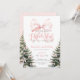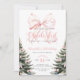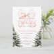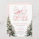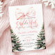 Invitación de primer cumpleaños con pinos y detalles de arco rosado para el Chica de invierno de Bow Onerderland.