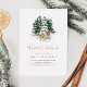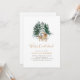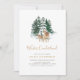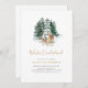 Celebra el primer cumpleaños de tu bebé con esta invitación de cumpleaños neutral de género que incluye un ilustracion de un peón con tema de acuarela de invierno y un ciervo frente a un bosque de nieve.