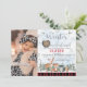 Invitación al cumpleaños Invitación a los bosques dulces en invierno de un solo páramo con tema de primer cumpleaños con cuatro lindos animales de bosque, un pequeño arreglo floral rosado, pinos, nieve y un patrón de manto de búfalo. Esta invitación de cumpleaños de un solo páramo para el invierno de los bosques también incluye una foto y es una manera bonita de invitar a los invitados a una fiesta de primer cumpleaños para una niña en un bosque de invierno.