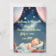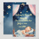 ¡Bienvenido a tu bebé niño con esta invitación pacífica y soñadora! Con un recién nacido durmiendo bajo una suave noche estrellada, enmarcado con cortinas suaves y una cuna acogedora. Perfecto para fiestas de bebé, anuncios de nacimiento o fiestas de bienvenida. Totalmente personalizable con los detalles de tu bebé.