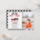 Dos autos rápidos compiten en estas lindas invitaciones para fiestas de cumpleaños de niños con una carrera de autos rojos. Tema de carreras para un fiesta de segundo cumpleaños con un ilustracion de un auto rojo con las palabras "Crecer demasiado rápido".