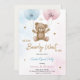 "Invitation card for a gender reveal party featuring a cute teddy bear holding blue and pink balloons. Text reads 'He or She, We can bearly wait to see.' The design is playful and welcoming. The card includes party details at the bottom."