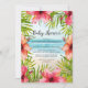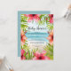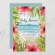Curva tropical acuática floral neutra con ducha de bebé con fondo de playa enmarcada por flores de hibisco y hojas de palma. El lado inverso es un azul océano sólido. Personalice los detalles de la ducha para bebés.