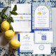 Celebrate your Italian summer destination wedding with a chic La Dolce Vita themed invitation. Featuring Mediterranean tiles in blue, white, and yellow, this elegant design is accented with a trendy arch, fresh lemon gelato illustration and script calligraphy. Inspired by Positano and the Amalfi Coast, it captures the romance and joy of a sun-soaked seaside celebration and sets the perfect tone for a stylish Mediterranean wedding. Please contact me if you have any requests for custom products.