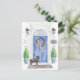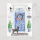 Anuncie su nueva dirección con nuestra elegante invitación con un Bouvier des Flandres, puerta delantera azul, alfombra de bienvenida, letrero de pizarra, topiarios y una corona floral sobre un fondo de ladrillo gris.