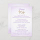 Tarjeta de información de invitación de boda de playa con una hortensia púrpura y concha en un lado y estrella de mar en el otro. Itinerario en un lado y alojamiento en el otro. Personalice el texto como prefiera.