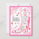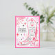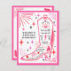 Invitación a fiesta de despedida de soltera con tema de rodeo disco de vaquera espacial con ilustración de bota de vaquera con flecos, rosa, rayo, corazones y estrellas con esquema de color rojo, rosa y negro. La parte posterior tiene el itinerario.