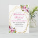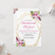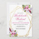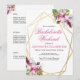 Flores tropicales de acuarela en rosa suave y púrpura dentro de un doble marco geométrico dorado con florituras botánicas y festivas. Personalice esta invitación de fin de semana de despedida de soltera con sus propios colores y fuentes o mantenga esta tipografía popular tal como está para su conveniencia. Mezcle y combine con otros artículos de esta hermosa colección de bodas.