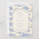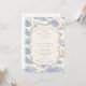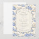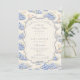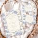 Un dulce diseño inspirado en época pasada que presenta delicados lazos azules, detalles de rayas suaves y encantadoras ilustraciones de jardín de arándanos. Arte estilo Toile con adorables animales y cestas de frutas crea un ambiente clásico de libro de cuentos en una paleta de azul suave en polvo. El marco central ornamentado añade elegancia mientras mantiene el aspecto general ligero, refinado y atemporal. Perfecto para un baby shower con un suave tema de jardín y un toque de encanto tradicional.