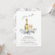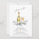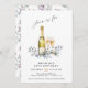 invitaciones para fiestas de cumpleaños con un ilustracion de flores color agua enmarcando una botella de champán. Se puede cambiar a cualquier edad. El lado inverso tiene un patrón floral coordinado.