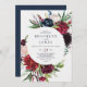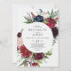 Esta burlona invitación a una boda casual en el jardín de otoño es perfecta para una boda en otoño. El diseño presenta unas impresionantes flores de color rosa, rojo, marino y burdeos, flores de flores y hojas verdes dispuestas en un marco floral de otoño animado.