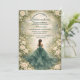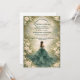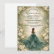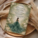 Este elegante diseño de quinceañera presenta un suave fondo de acuarela en verde esmeralda enmarcado por románticas rosas marfil, delicada vegetación y sutiles acentos dorados, con una ilustración de vestido elegante que crea una atmósfera refinada y encantada de jardín. La rica paleta verde combinada con flores clásicas le da al diseño un toque lujoso y juvenil, perfecto para una celebración de quinceañera atemporal con una estética romántica e inspirada en la naturaleza.