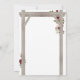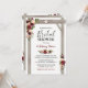 Invitaciones de despedida de soltera de boda de otoño que presentan un fondo blanco chic clásico que se puede cambiar a cualquier color, una exhibición floral de acuarela rosa y burdeos, marsala rojo en una pérgola de boda de madera rústica, un corazón tallado con las iniciales de la pareja, y una plantilla de invitación de fiesta de boda moderna.