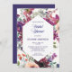 Las vibrantes imágenes de las flores de color de agua deslumbrantes hacen un colorido borde en esta memorable invitación a la ducha de novias que es apropiada para primavera, verano y otoño. Los colores de las imágenes florales incluyen violeta violeta, mandarina pálida, naranja, cardenal y verde suave. En el fondo blanco se ha colocado una sobrecubierta de confeti dorado sutil que añade un poco de brillo. En el centro hay un hexágono blanco que contiene el texto personalizado en azul oscuro. ¡¡¡La parte trasera de la invitación es azul sólido!!