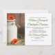 Una invitación de boda con un tema de boda rústica con una jarra de leche blanca y flores naranjas sentadas en un granero sobre heno.