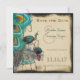 Dos pavos reales sentados en un tronco con una jaula para pájaros caprichosa y plumas de pavo real en pergamino falso quemado, divertido y lindo Ahorre la Fecha. Temas de pavo real de granero rústico de casa de campo o pájaro de la edad media renacentista vintage jaula para pájaros de pavo real